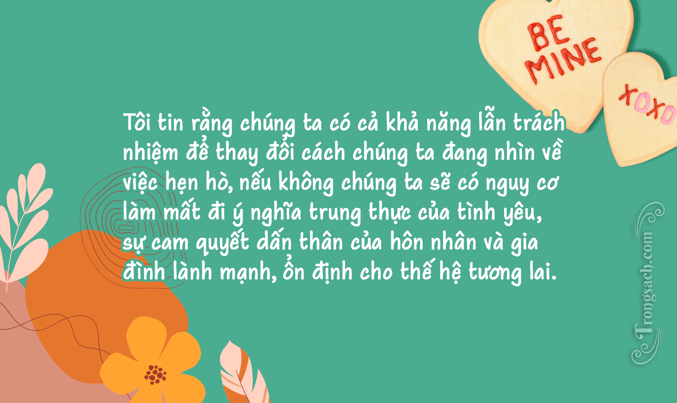 Tôi tin rằng chúng ta có cả khả năng và trách nhiệm để thay đổi cách chúng ta đang nhìn về việc hẹn hò, nếu không chúng ta sẽ có nguy cơ làm mất đi ý nghĩa trung thực của tình yêu, sự cam quyết dấn thân của hôn nhân và gia đình lành mạnh, ổn định cho thế hệ tương lai. Mọi sự bắt đầu với việc hiểu thấu một vài những tư tưởng nguy hiểm mà nhiều người đang chấp nhận trong bối cảnh hẹn hò thời nay.