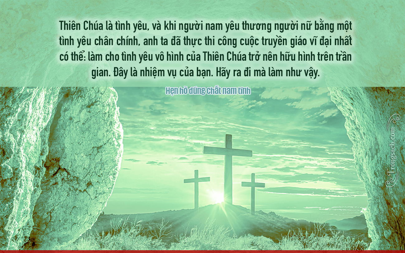 Thiên Chúa là tình yêu, và khi người nam yêu thương người nữ bằng một tình yêu chân chính, anh ta đã thực thi công cuộc truyền giáo vĩ đại nhất có thể: làm cho tình yêu vô hình của Thiên Chúa trở nên hữu hình trên trần gian. Đây là nhiệm vụ của bạn. Hãy ra đi mà làm như vậy.