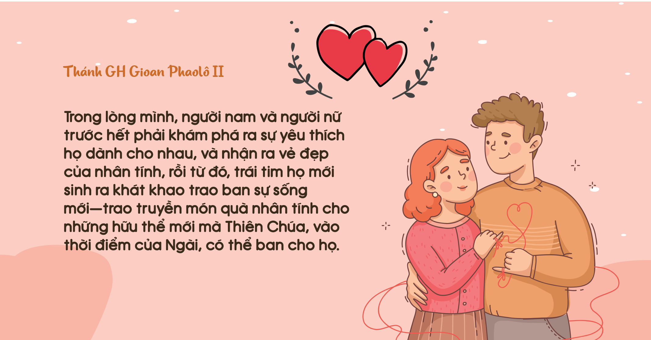 Điều đáng lưu ý là những lời thiết lập hôn nhân không phải là những lời đầu tiên mà Đấng Tạo Hóa phán với người nam và người nữ. Những lời đầu tiên ấy nói về sự kết hợp thể xác giữa hai người trong hôn nhân, như thể được nhìn từ viễn cảnh chọn lựa trong tương lai: người nam sẽ lìa cha mẹ mình và gắn bó với vợ mình, trở nên một xương một thịt với nàng, và khởi đầu9 cho một sự sống mới (St 2:24). Ngay từ khởi đầu, việc duy trì nhân loại đã được liên kết với trật tự nảy trong công trình tạo dựng của Thiên Chúa. Tuy nhiên, chính việc duy trì ấy đã hàm chứa một sự ưu ái yêu thương rồi. Trong lòng mình, người nam và người nữ trước hết phải khám phá ra sự yêu thích họ dành cho nhau, và nhận ra vẻ đẹp của nhân tính, rồi từ đó, trái tim họ mới sinh ra khát khao trao ban sự sống mới—trao truyền món quà nhân tính cho những hữu thể mới mà Thiên Chúa, vào thời điểm của Ngài, có thể ban cho họ.