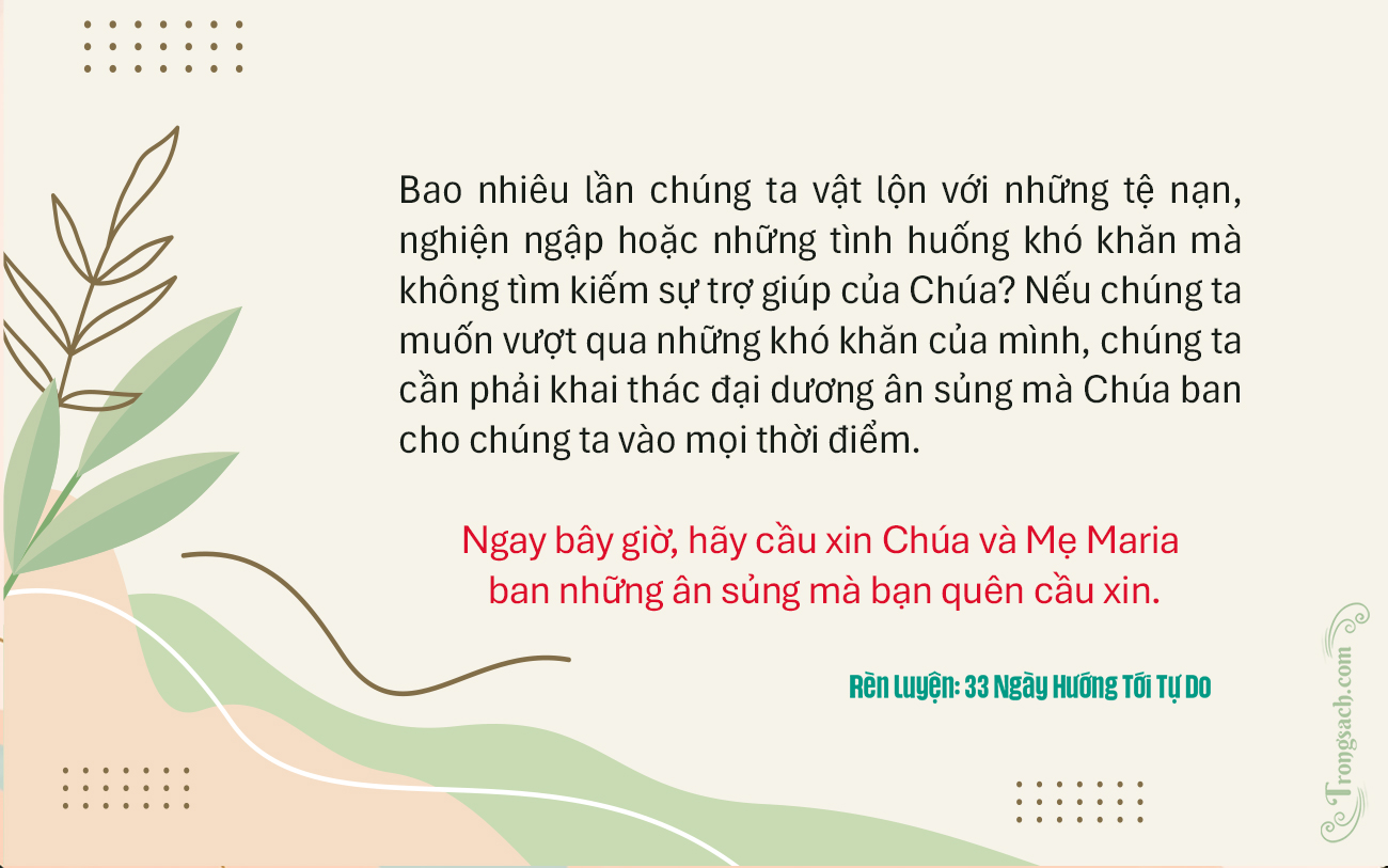 Bao nhiêu lần chúng ta vật lộn với những tệ nạn, nghiện ngập hoặc những tình huống khó khăn mà không tìm kiếm sự trợ giúp của Chúa? Nếu chúng ta muốn vượt qua những khó khăn của mình, chúng ta cần phải khai thác đại dương ân sủng mà Chúa ban cho chúng ta vào mọi thời điểm. Ngay bây giờ, hãy cầu xin Chúa và Mẹ Maria ban những ân sủng mà bạn quên cầu xin. Nếu bạn đang vật lộn với sự dâm dục, hãy cầu xin ơn trinh khiết. Nếu bạn gặp khó khăn vì tuyệt vọng, hãy cầu xin hy vọng. Nếu bạn chiến đấu với sự ích kỷ, hãy cầu xin một trái tim vị tha. Nếu bạn đang phải vật lộn với chứng nghiện, hãy cầu nguyện để được giải thoát. Đúng là các đức tính cần có thời gian để phát triển, nhưng Chúa hứa, “Anh em cứ xin thì sẽ được, cứ tìm thì sẽ thấy, cứ gõ cửa thì sẽ mở cho. Vì hễ ai xin thì nhận được, ai tìm thì thấy, ai gõ cửa thì sẽ mở cho” (Lu-ca 11, 9–10). (Video cho ngày 14)