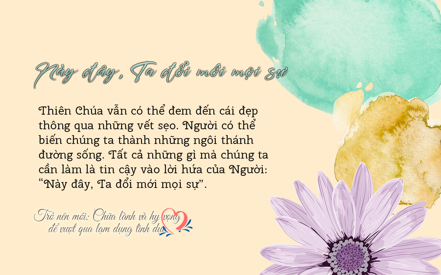 Bạn có một tia sáng để chiếu tỏa và một tình yêu mạnh mẽ để trao ban. Đừng sợ rằng những vết sẹo của bạn sẽ làm mờ đi ánh sáng đó. Bạn có thể cảm thấy đời mình đã tan vỡ không cách gì hàn gắn, nhưng hãy xem xét điều này: Khi bạn nối những mảnh kính vỡ lại với nhau và để cho ánh sáng huy hoàng chiếu trên chúng, bạn đã tạo thành những tác phẩm kính màu nghệ thuật. Cũng vậy, Thiên Chúa vẫn có thể đem đến cái đẹp thông qua những vết sẹo. Người có thể biến chúng ta thành những ngôi thánh đường sống. Tất cả những gì mà chúng ta cần làm là tin cậy vào lời hứa của Người: “Này đây, Ta đổi mới mọi sự” (Kh 21, 5).